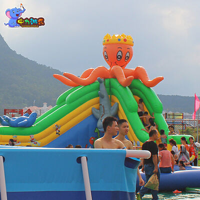 The inflatable slide is made of high-strength and environmentally friendly PVC material, with a double-layer mesh structure for enhanced strength, preventing tearing and resisting impact.