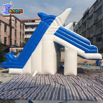The inflatable slide features a lifelike blue dolphin design. The white wave patterns decorate the slide. The upward tilt of the dolphin's tail enhances the dynamic effect, making it look like a dolphin leaping out of the water, which stimulates children's curiosity to explore.