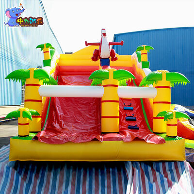 This inflatable slide is themed around "Dinosaur Adventure". At the top of the slide stands a cute red inflatable dinosaur, with its arms spread wide as if welcoming the arrival of young explorers. Complementing it are green palm tree-shaped pillars, creating a rich tropical jungle exploration atmosphere, which fully stimulates children's imagination and adventurous spirit.