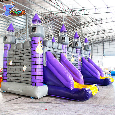 The two sides of the inflatable slide are equipped with separate slides. The slide track is in bright purple color, and a yellow buffer area is provided at the bottom.