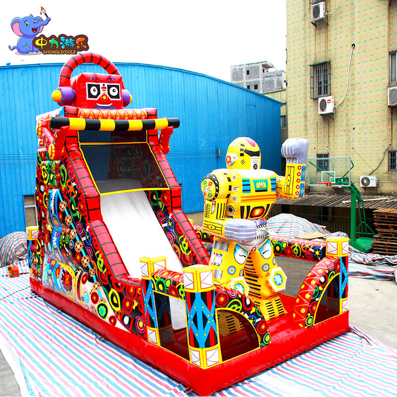 "The Colorful Robot" inflatable slide is an innovative product that combines robot themes, interactive play, and safe experiences. The slide features a bright yellow robot as its main highlight, along with a colorful radio-shaped entrance and a variety of pattern decorations, creating a play space that blends technology and childlike charm. The product uses high-saturation colors such as red, yellow, and blue, and is specifically designed for children aged 3 to 10. It is an ideal choice for shopping malls, amusement parks, and celebration events.