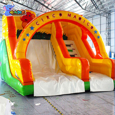 The "Magical Circus" inflatable slide is a themed amusement facility specially designed for festival events. The product is inspired by the classic circus theme. The top archway prominently displays the words "CIRCO MAGICO" (Magic Circus). It is complemented by orange and yellow guardrails, a white slide, and a green base, with an overall bright and lively color scheme. The top of the slide is decorated with blue star patterns and cartoon bear images, full of childlike charm and magical atmosphere, making it particularly suitable for use in festivals such as Halloween.
