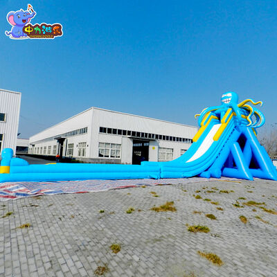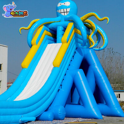 The "Octopus Warrior" inflatable water slide is an outdoor water play facility with an ocean adventure theme. The product features a cute and endearing blue octopus as its core design. The white slide path winds its way out of the octopus' open smiling mouth, and ends at a blue and yellow buffer pool. The octopus' tentacles surround the slide, and the bright colors and wave patterns create a playful atmosphere of an ocean paradise. It is specially designed for summer outdoor activities and provides a safe and thrilling water play experience for children aged 3 to 12.