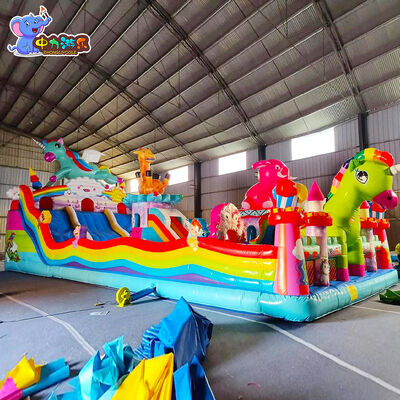 "The Happy Duck Castle" is an outdoor inflatable amusement facility themed around cute little yellow ducks. The product features a bright yellow color scheme. The top of the castle is decorated with adorable duck-shaped designs, complemented by white stripes and a rainbow arch design. The overall appearance is lively and dynamic. It is specifically designed for children aged 3 to 10 and is suitable for outdoor squares, parks, community events, etc., providing children with a safe and fun amusement experience.