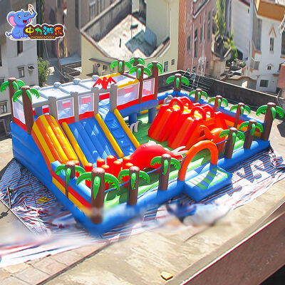 Tropikal yağmur ormanları sahnesi: palmiye ağaçları, volkanlar ve diğer şişme dekoratif elemanlarla şişme kale